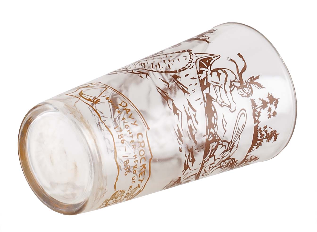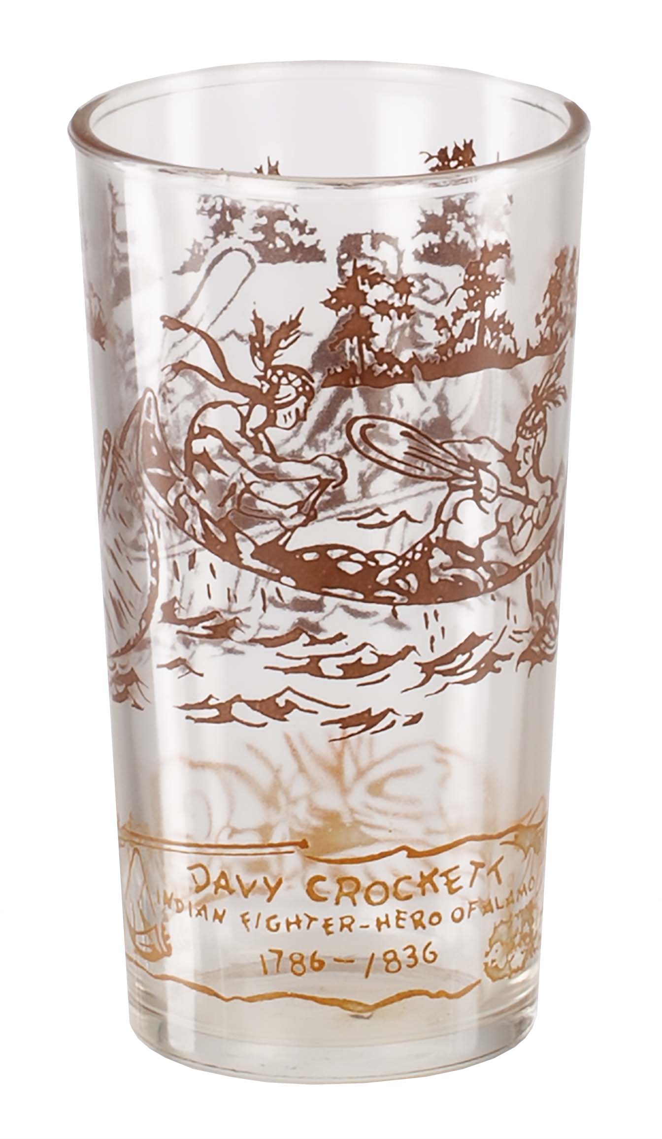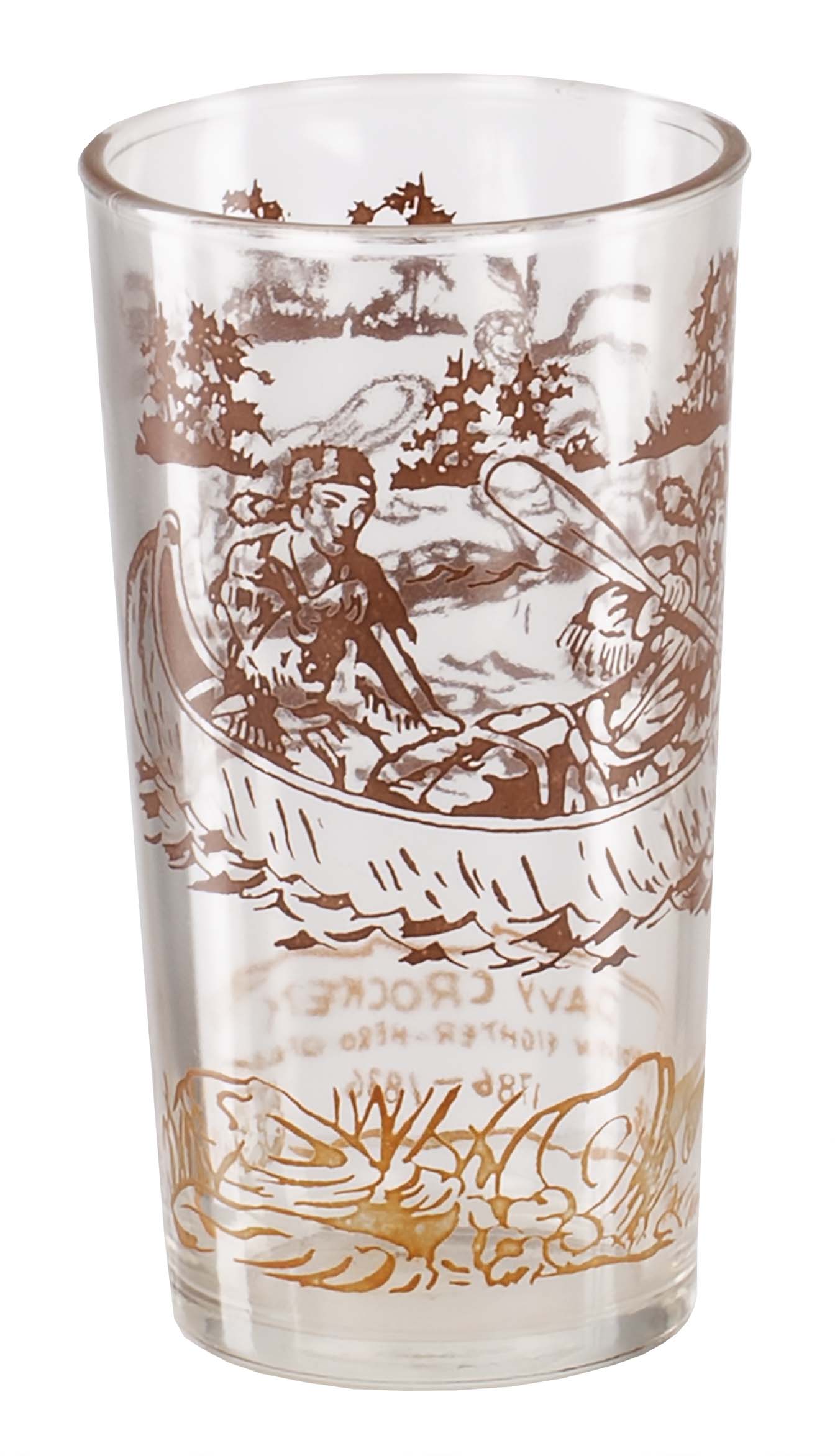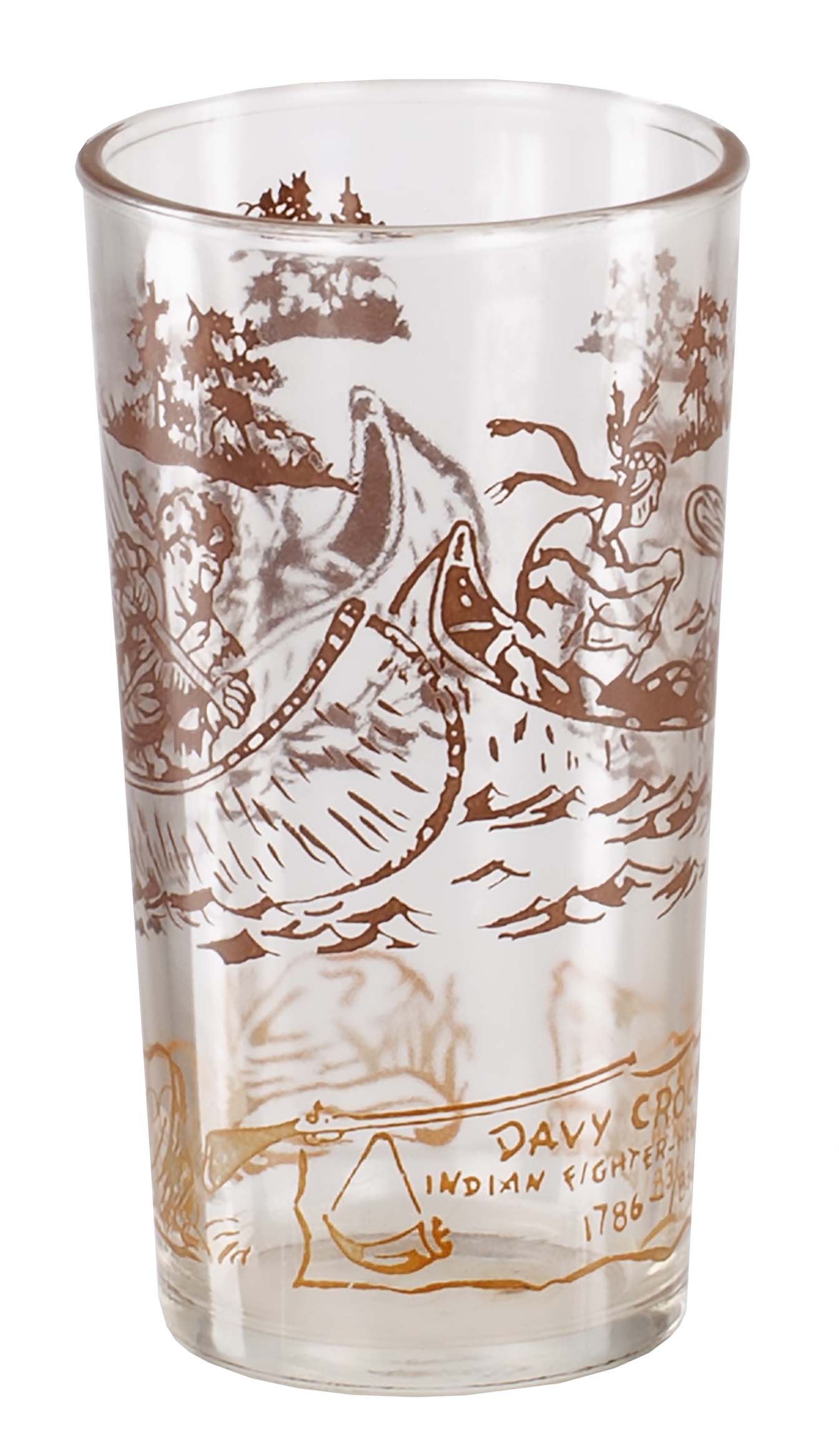 "Davy Crockett Juice Glass" Brown decorating on top and gold on the lower area. |