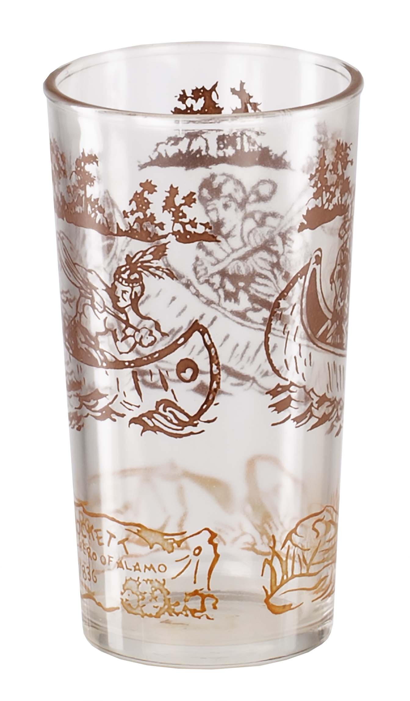 "Davy Crockett Juice Glass" Brown decorating on top and gold on the lower area. |